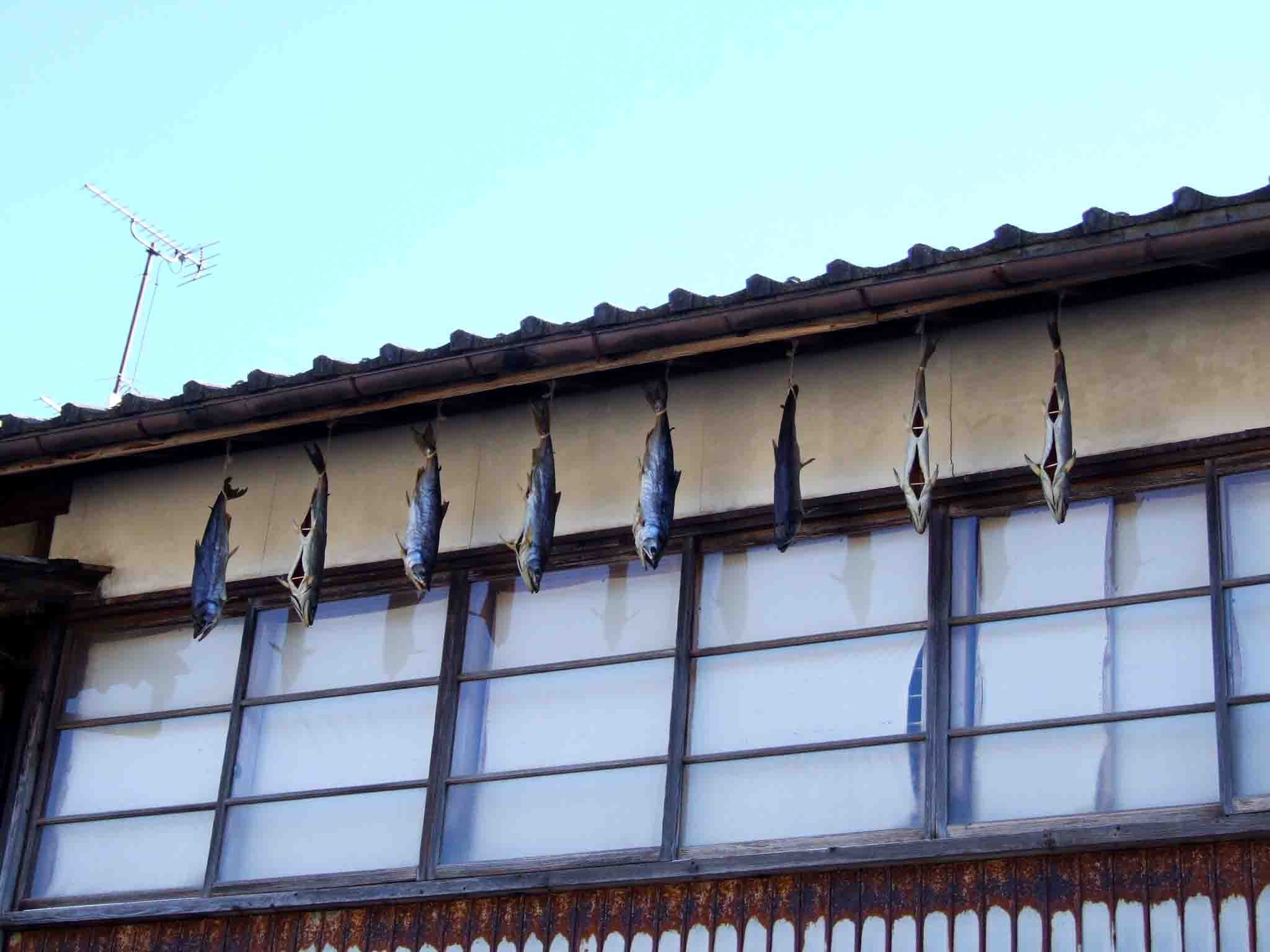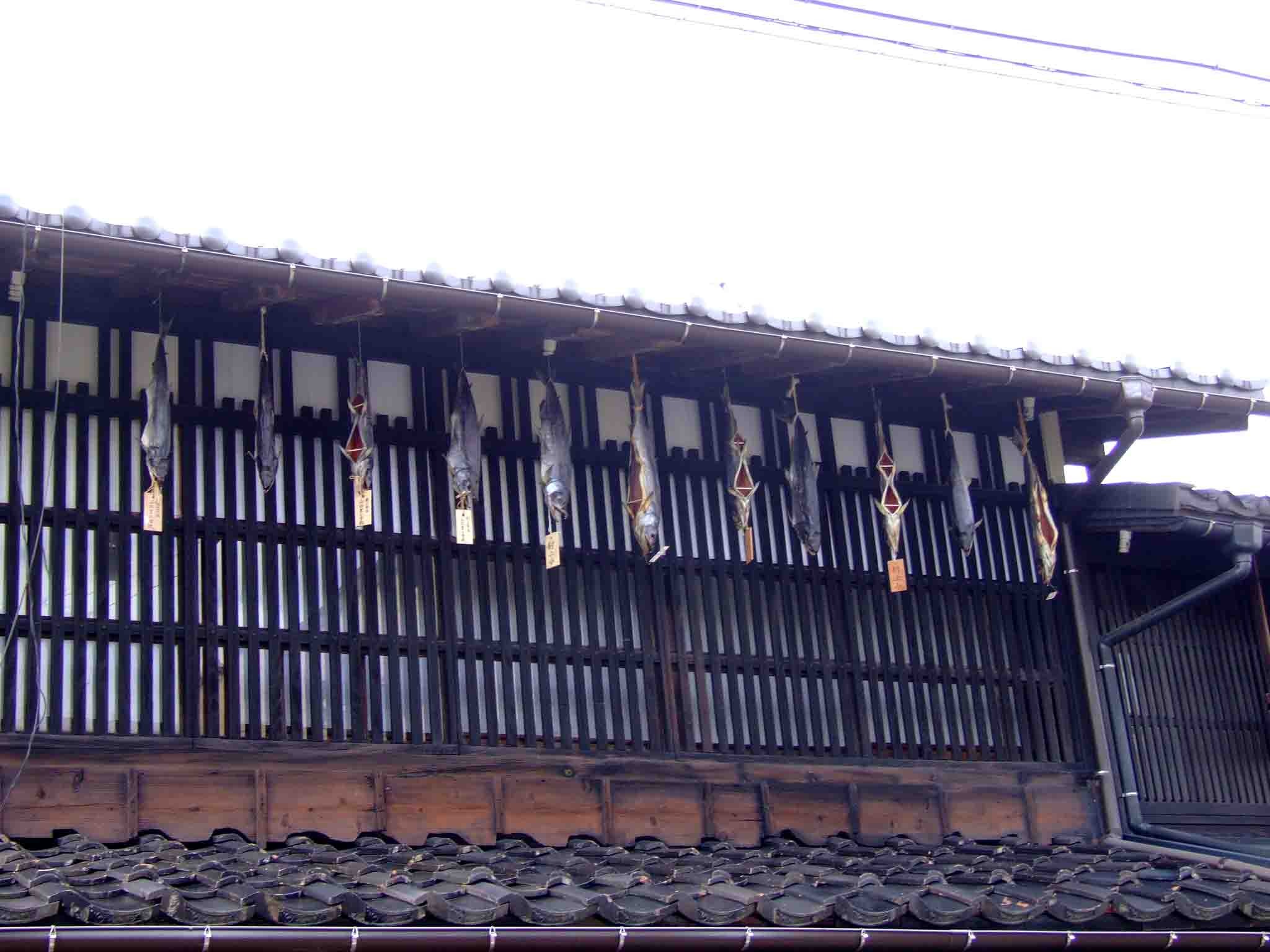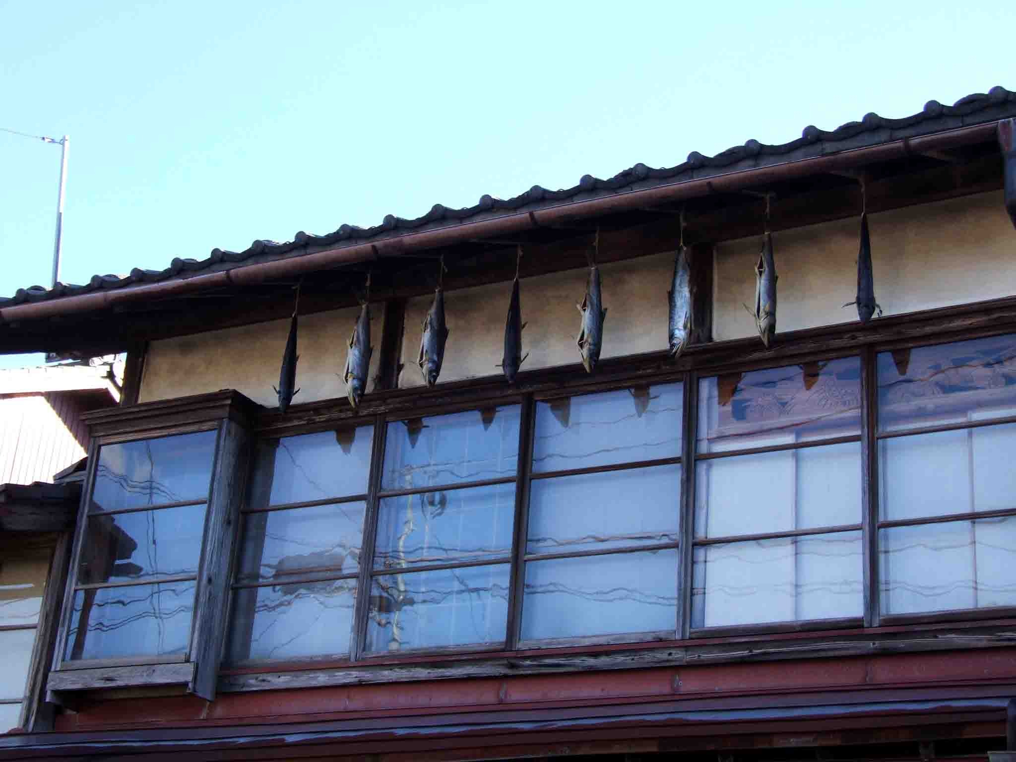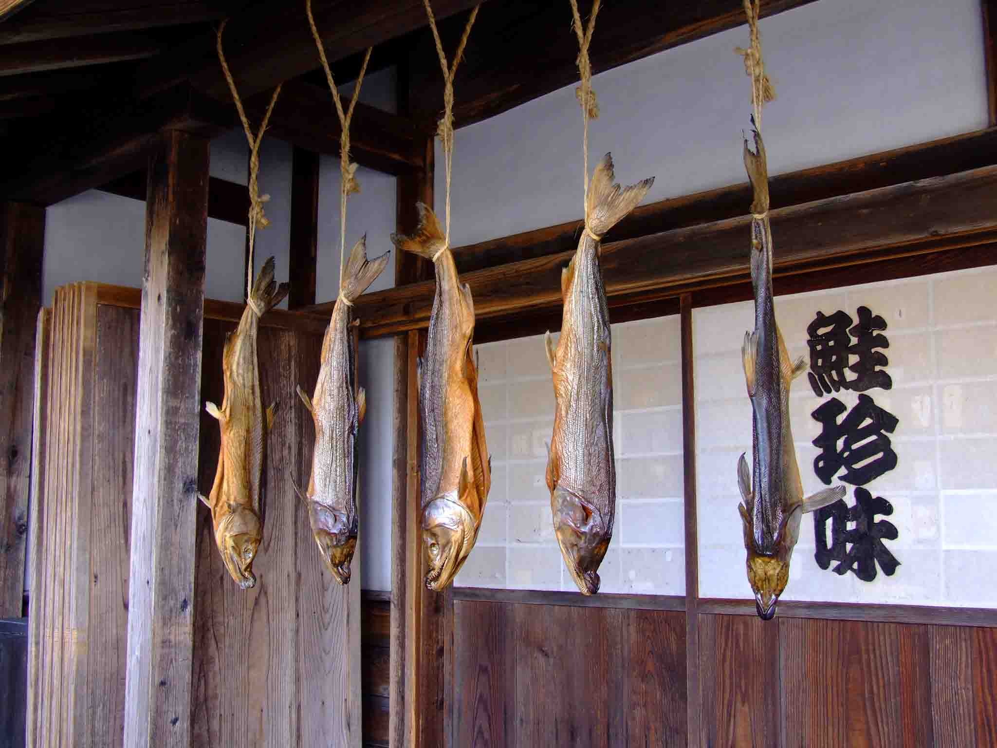 田村酒店ではタヌキが鮭を食べたそうに見上げていました。